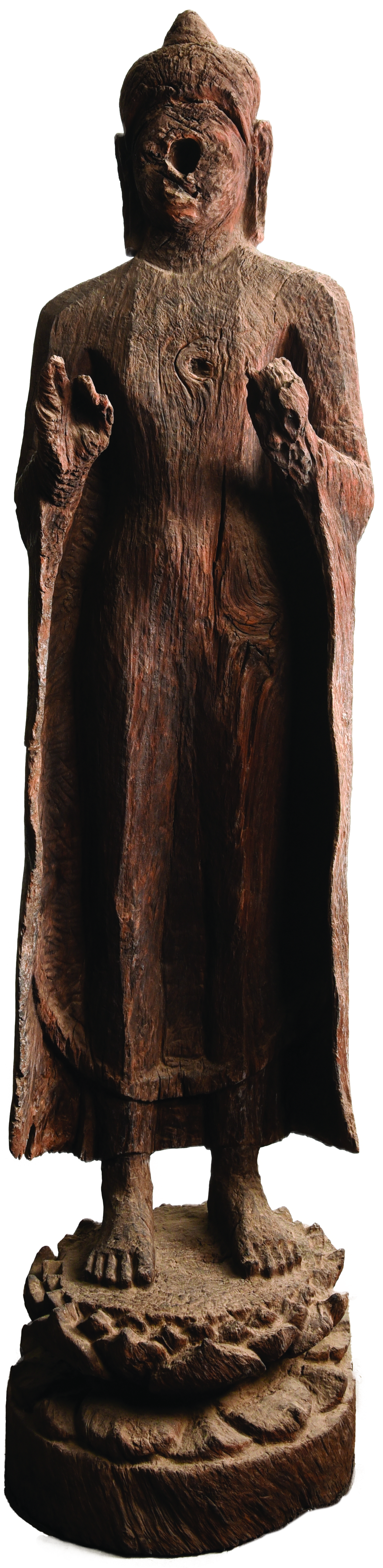 Tượng Phật được tạc bằng gỗ mù u, đứng trên bệ hoa sen. Dáng tượng thanh mảnh, đầu đội mũ tròn, trên đỉnh đầu có chóp nhọn (có thể là nhục kế unisa). Thùy tai dài chấm vai. Hai cánh tay đưa ra phía trước, dạng thủ ấn. Y phục phủ dài xuống chân tạo thành hình vòng cung. Tượng được tìm thấy tại Lợi Mỹ - Đồng Tháp.