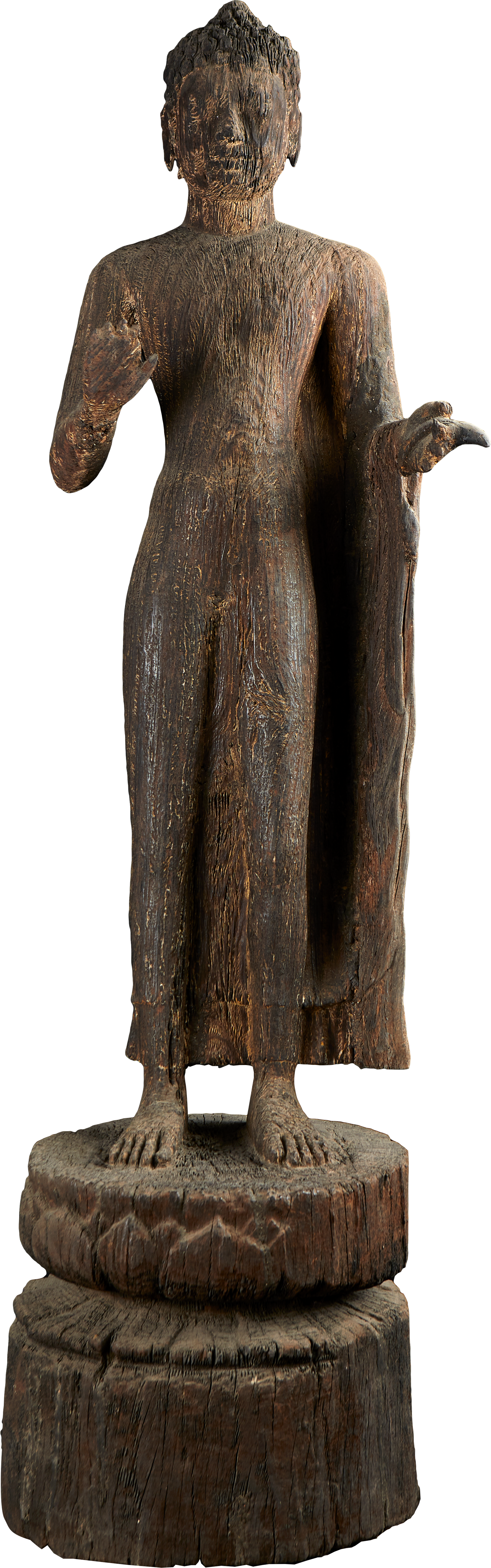 The Buddha statue is made of lagerstromia wood, in a standing position on the lotus pedestal. On top of the head of the statue is a unisa, spiral hair. The Buddha's monastic robe covered on left shoulder. The left hand holds a part of his monk's robe, the right hand in the mudra posture. The statue was found in Binh Hoa - Long An.