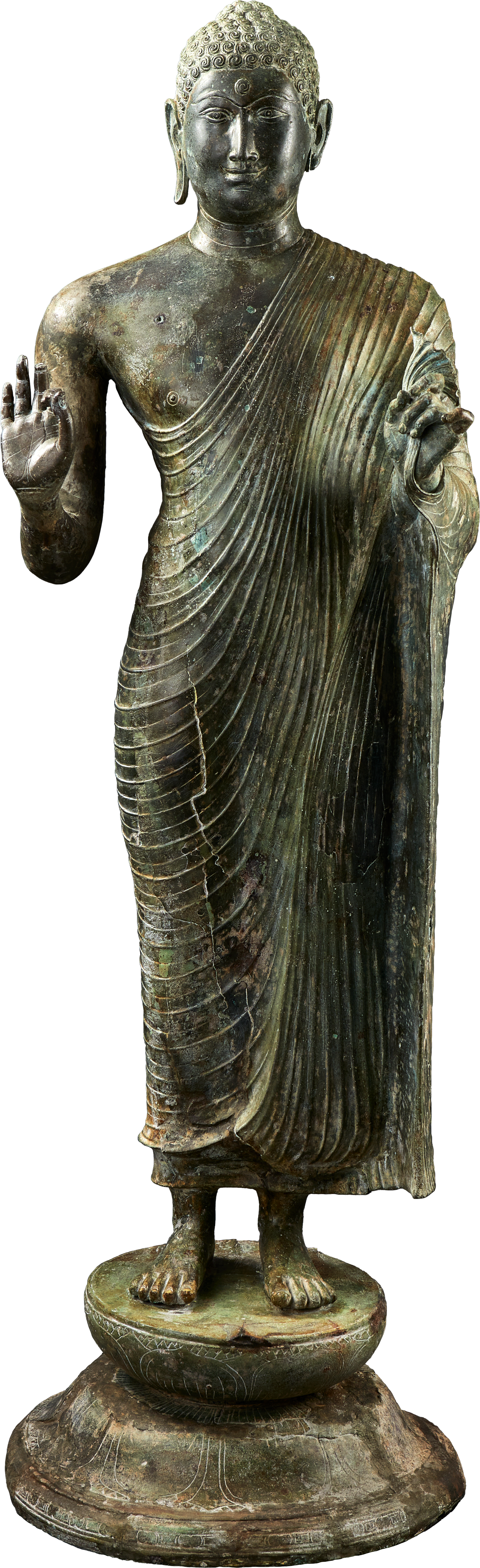 The statue was discovered and published in 1901 by Louis Finot in Dong Duong (Quang Nam), along with 228 artifacts. The statue is made of bronze, standing on a lotus pedestal. Spiral hair, long ear lobes, round and kind face. The middle of the forehead is engraved a floating circle, the curved eyebrows, and the nose is slender. High neck with three folds (is one of the appearance of the noble Buddha). The body of the figure is clothed with a monk's robe with many creases. Two arms outstretched forward. The right hand with the Vitarkamudra (Gautana's teaching), the left hand holding the lap.