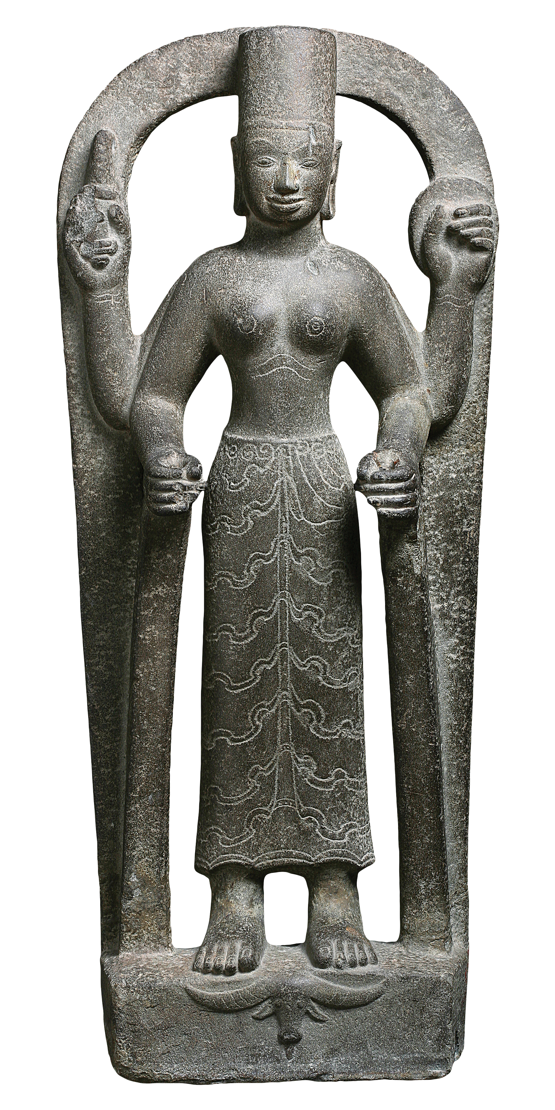 The statue is carved out of sandstone, in a standing posture on a pedestal with behind the arc. The bull's head on the pedestal indentifies this figure as Dugar, an important Hindu goddess. She wears the mitered headdress. She has four hands: the rear hands, one hand holds a round plate and other one holds a dagger; the fore hands propped down the staff, probably also holding the key attributes. Her upper body is bare. The lower body wears sampot or long skirt, incised lines on her skirt, intended to depict folds and a belt. The statue was found in Lien Huu - Tra Vinh.